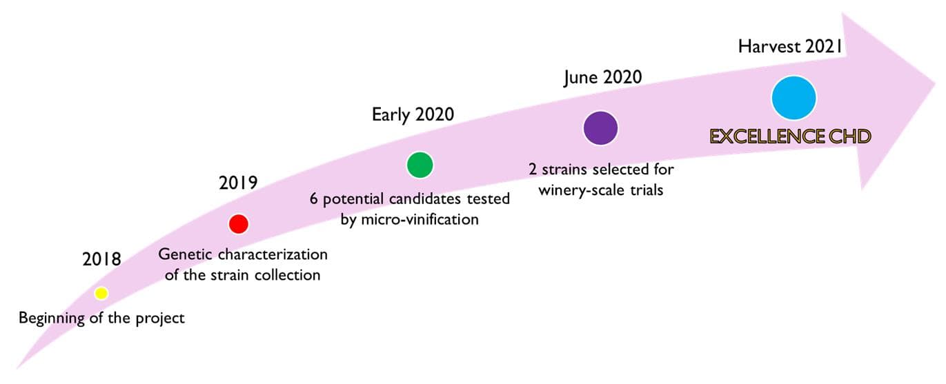 Excellence CHD is a Burgundian isolate released on the Australian market in 2022 and is was selected through a collaboration between Lamothe-Abiet of Bordeaux and the Institut Français de la Vigne et Vin de Beaune (IFV). 590 yeast strains were initially harvested from selected vineyards and wineries in Burgundian Chardonnay in 2017, so from inception to commercial release this process took five years for the northern hemisphere and six years for the southern. The general process is outlined chronologically by stages in Figure 1.