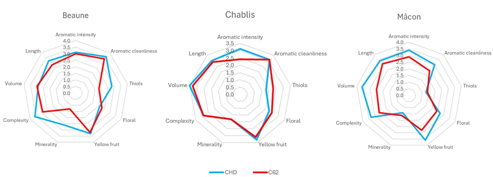 The wines obtained from the Chablis trial were the most organoleptically similar, which is perhaps not unexpected given that Chablis lies furthest to the north, although Excellence CHD did produce a stronger aromatic profile overall than C62. The wines from Beaune showed strong differences in the areas of length, complexity, minerality and thiols, and in all these areas Excellence CHD was superior. In the southern Burgundian region of Mâcon, the trial wines were rather different organoleptically, with Excellence CHD proving significantly superior in length, volume, complexity and in terms of the aromatic profile. The organoleptic differences observed across all three regions serve to emphasise the need for multi-regional trials when seeking to compare yeast strains.