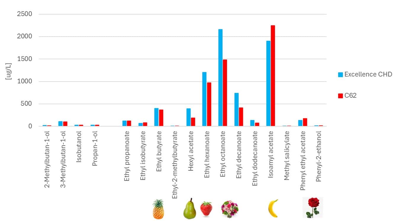 The main aromatic differences between the two wines were found to be in the fruit and floral domains. Excellence CHD delivered stronger notes of pineapple, pear and strawberry, in addition to floral aromas. Strain 62 only surpassed Excellence CHD in the production of isoamyl acetate (banana), which is perhaps the least desirable fermentation ester, and minorly in the rose petal character. These differences explain the greater overall aromatic intensity observed by tasters in the Excellence CHD wine. Tasting panels are crucial for quantifying characteristics such as palate weight and complexity as the methods do not yet exist to reliably quantify these parameters.