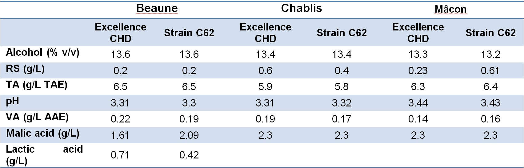 Over the following two years winery-scale evaluations were conducted in the traditional Chardonnay regions of France (Chablis, Beaune and Mâcon) as well as in the Loire Valley (data not presented). The trial data for Beaune (barrel fermentation), Chablis (25 kL stainless steel tanks) and Mâcon (30 kL stainless steel tanks) are given in Table 2. From a chemical perspective, only minor differences were observed between the strains across all three sites discussed. In the Beaune trial MLF commenced rapidly in some of the barrels, suggesting that both Excellence CHD and C62 are MLF-friendly (i.e. low production of fatty acids and SO2), resulting in increased lactic acid levels. VA levels were very low for all trial wines and residual sugars were also low. These positive physicochemical results were expected given the rigorous preselection process that both strains had been subjected to in order to make it this far down the pathway to commercialisation.